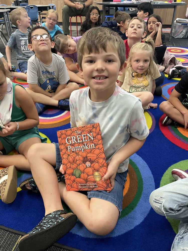 Carter, a student in Mrs. Garrison’s first grade class, brought the book The Green Pumpkin for his teacher to read aloud to the class. This book is extra special because it was illustrated by Carter’s great uncle!