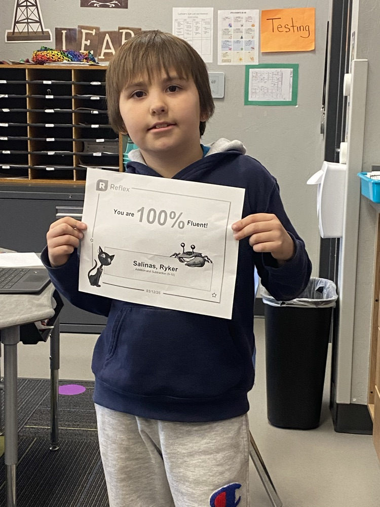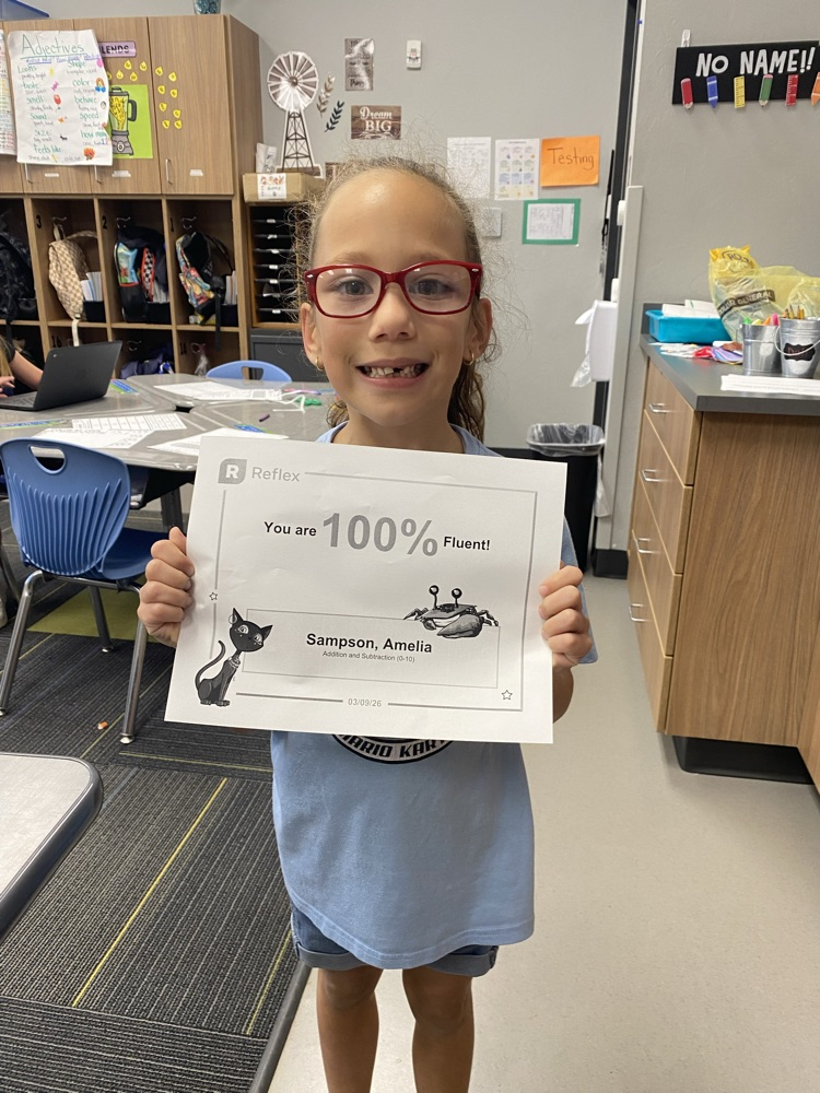 Rodie Dixon, Ryker Salinas, and Amelia Sampson all reached their Reflex addition and subtraction goal of 100%. Mrs. Luttmer is so proud of all three of you!